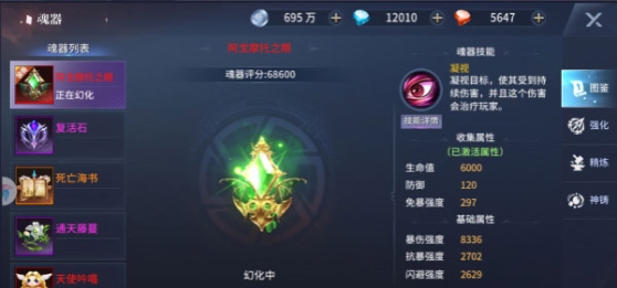 强化:使用强化道具或者橙色0星装备可提升强化等级,增强魂器基础属性,强化等级可以继承,更换魂器强化等级不变。
