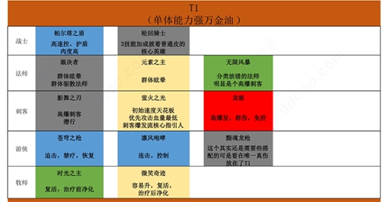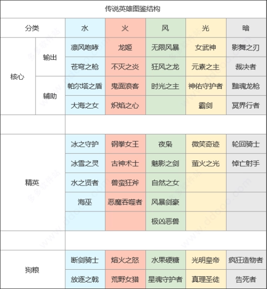 2、忽略史诗(紫色)英雄,我们可以根据技能强度和获取难度对传说英雄进行分类,下面是总表: