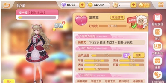 打开伙伴界面点击你想要操作的伙伴,或者直接点击萌屋场景内忙碌玩耍的伙伴,进入伙伴的详细属性界面~每日有5次摸一摸机会,每一次都会提升不少的好感度。