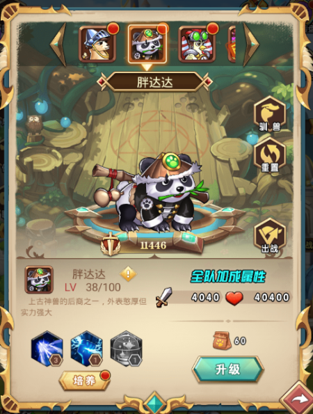 第二个为大家介绍的是我们的小熊猫胖达达,上古神兽的后裔之一,外表憨厚但实力强大。可不要被它萌萌的外表欺骗哦,胖达达可是一只攻击非常凶残的宠物呢!