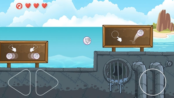 4、在前进过程中会出现拦路的怪物,你需要操控豆豆先向上跳躲开,再攻击怪物。