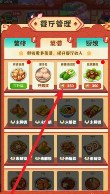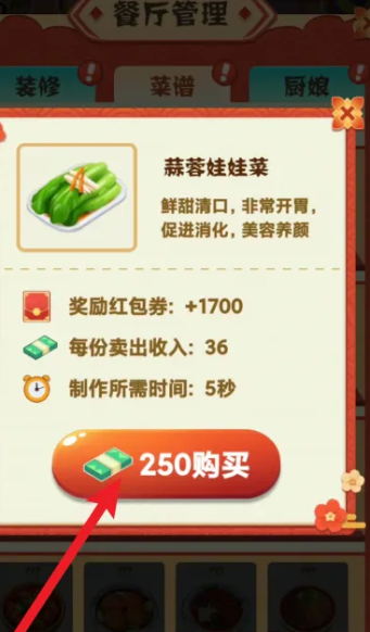 4、点击一个还没学会的菜谱,需要用金钱购买