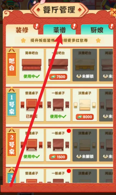 1.在这里装饰餐厅的方法非常简单,有不同类型的物品都能解锁。