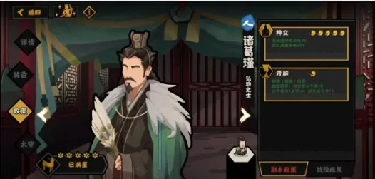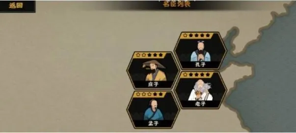 1、多带名臣,名臣作用各不相同:墨子(墨守加防御),李牧(神,前期点出据守加防御,中期点出另一个加兵,相当于子弟兵),商鞅(拿来治国的),孟子(加快回复行动力,)。