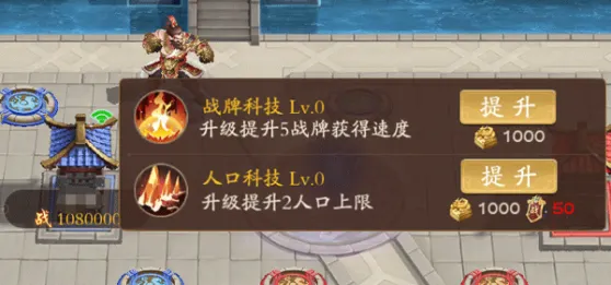5、点击带有自身名称的科技建筑可以升级塔防科技,人口科技可提升上阵人口上限,武魂科技可提升战牌的获取速度