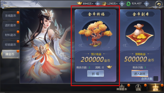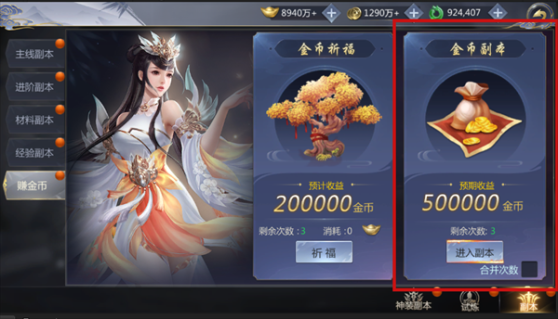 每天有3次机会可以进入金币副本,可选择【进入副本】进行单次挑战,也可以勾选【合并次数】,即是将当天3次的挑战次数合并成1次,对金币副本发起挑战。