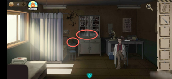 去医务室,桌上拿试管。放上目镜,将目镜边缘两圈字母对齐,获得线索“红蓝黄蓝红”。点击柜子,放入试管,点击药瓶再点击试管即可放入药物,按线索顺序配药。将试剂给A先生,获得按键。