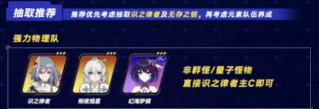 5、主C方面,冰元素推荐魇夜星渊、理之律者(魇夜星渊会更强一点,但也更依赖骇兔),雷元素推荐雷之律者(增幅迅羽可过渡),火元素推荐不灭星锚(女武神荣光可过渡),当然如果家园补给中抽取到了苍骑士月魂,也可以直接作为冰元素强力输出来养成。几位角色中理之律者和苍骑士·月魂的培养成本最低,其毕业圣痕均为万象虚境中可以肝取的安娜套装,无需抽取蛋池。