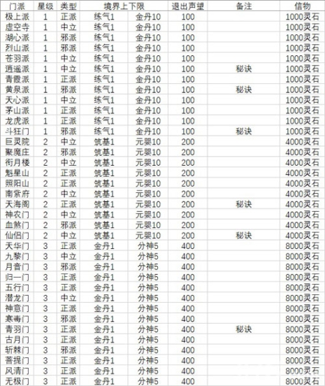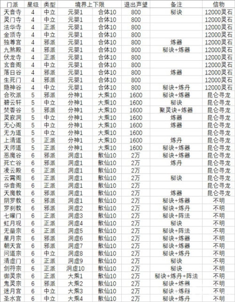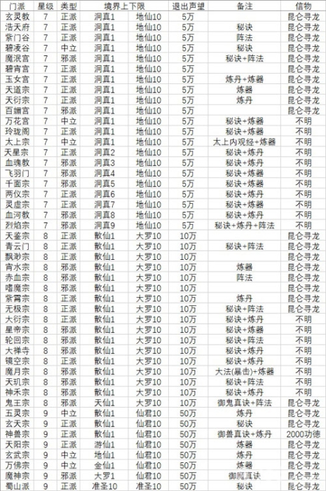 【境界对应门派一览表】