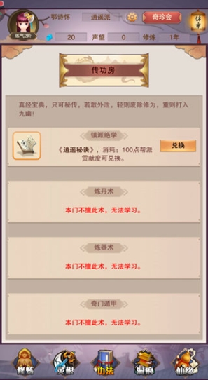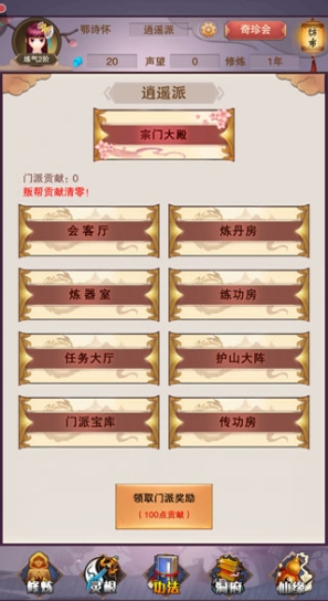 玩家还可在门派的炼器室、炼丹房、传功房中进行炼制、锻造及学习。这些功能房间的开启取决于门派的实力如何,所以想要更好的提升自身实力拜入一个强大的门派是很有必要的。玩家可在任务大厅接取任务来获取贡献点,贡献点可用于提升自身实力。