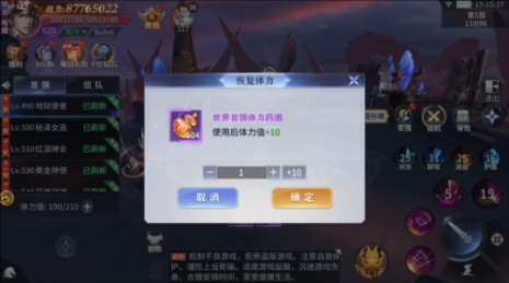 当上仙们等级达到120级即可开启【世界领主】,挑战世界首领可获得大量珍稀装备。世界首领无限层击杀首领不消耗体力,第一层及以上层数击杀首领需消耗一定体力。造成首领血量1%的伤害即可获得归属奖励。体力值小于首领所需消耗体力时,无法对首领造成伤害。体力可通过时间持续恢复,每6分钟消耗一点,恢复到上限后则不会继续恢复,也可使用世界首领体力药酒补充体力值。