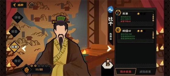 首先民生这里大多都是减消耗,加人口增速和钱粮产量的技能居多,基本偏刷资源很少有能配合别的体系的,但比干显然是一个例外,他自带循环技能和buff技能让他自成一系。低腐化和减钱粮消耗都是非常有用的属性。是一个可以一直用到后期的好名臣。