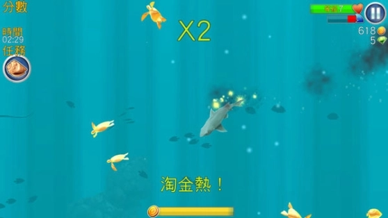 3、对弱点冲刺攻击。攻击成功,螃蟹会暂时逃开,我们的鲨鱼趁机到周围捕食进餐马上回来;