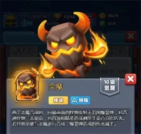 炎魔:当两个炎魔合成时,向最前面的怪物发射大范围爆裂弹,对普通怪物一击毙命,对首领和精英造成剩余生命百分比伤害,若其他英雄与炎魔进行合成,爆裂弹造成的伤害减半。