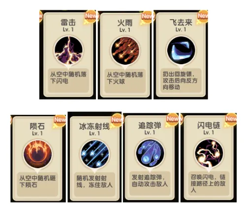 闪电链、追踪弹、冰冻射线、飞去来同类技能,均为自动索敌技能,前期因为范围较大较为好用,在关卡后期伤害略显不足,可根据实际需求选择。其中,冰冻射线附带冰冻控制效果,在某些情况下相对好用。