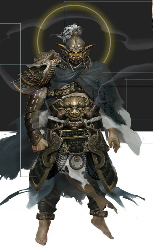 作为四圣之首又手握兵权,美术大大在设计天蓬元帅的时候以盔甲金属质感为主,也参考了很多古代将军的着装。细心的大家肯定也发现了美术大大在设计该BOSS时候也和他下凡取经的猪八戒的角色有呼应的细节,例如束腰这里有个猪脸形象的设计,还有例如天蓬元帅脸上戴的面罩虽然挡住了他脸的露出,但是我们可以对面具下的脸进行联想也很难不和猪八戒的形象联系起来。