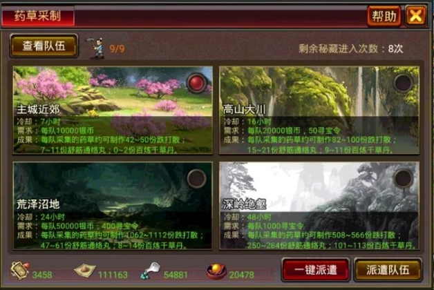 .通关52.乱世红颜后,派遣队伍进行药草采制,将有一定机率发现秘藏入口。