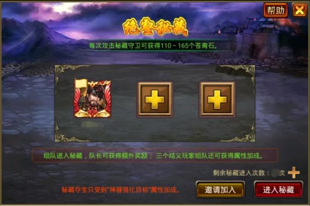 13.三个结义玩家组队进入秘藏,可获得结义属性加成。