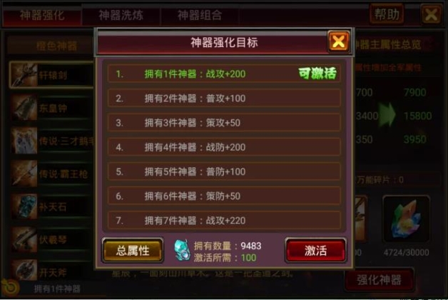 .当玩家拥有的神器满足目标条件时,即可激活目标并获得属性加成。