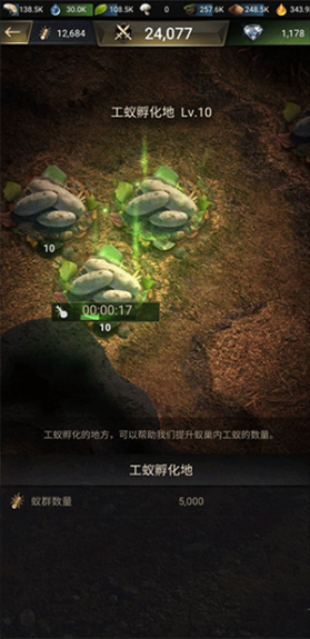 玩家们可以在游戏的布局中查看工蚁孵化地的具体位置,将它们提升到最高等级,不同建筑所需要的占地面积都是不同的,占地面积越大,所需要工蚁数量也就越多,所以尽量优先将占地面积为一的建筑先建完。