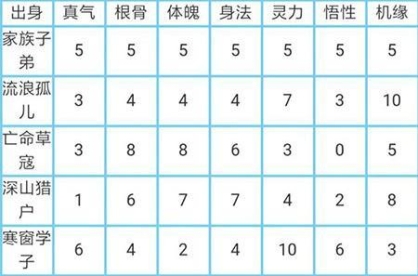 人物出身属性直接会影响到初始的各项成长值,选择适合自己的出身属性正是修仙之路的关键所在。