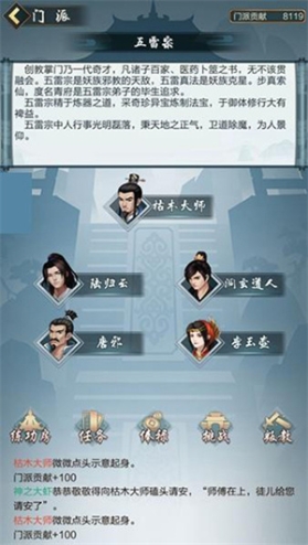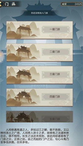 游戏中的门派有很多种,越高等级的门派星级越高,高星级的门派可以在掌门处学习到更高阶的功法,高阶功法则可以带来更高的属性提升。