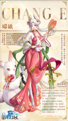 在第七幻域设定中,华夏神话中住在月球上的仙女。传说她本是凡人,因偷走了西王母赐予后羿的不死药而羽化飞升到了月球上,成为了广寒宫中的月之女神,别号“太阴星君”。