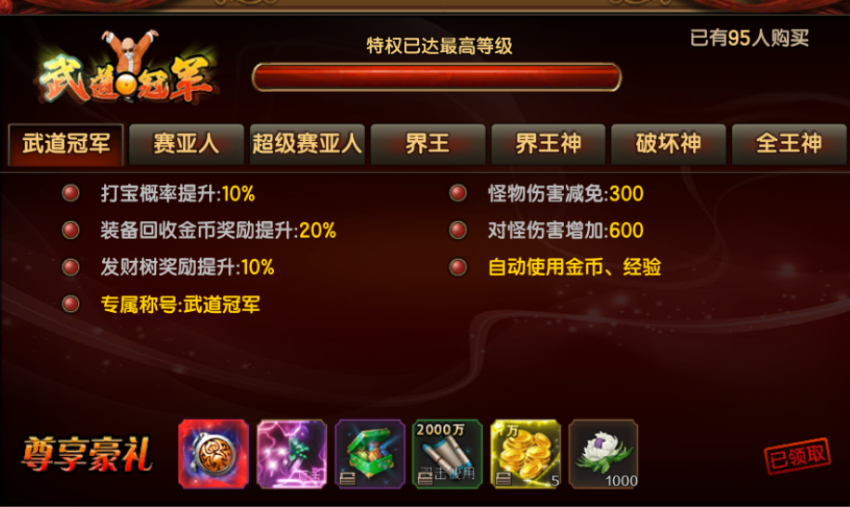 可以购买武道冠军或者赛亚人赞助特权!解锁自动使用金币、经验,解锁自动回收装备!通宵无忧挂机,起床神装满背包。