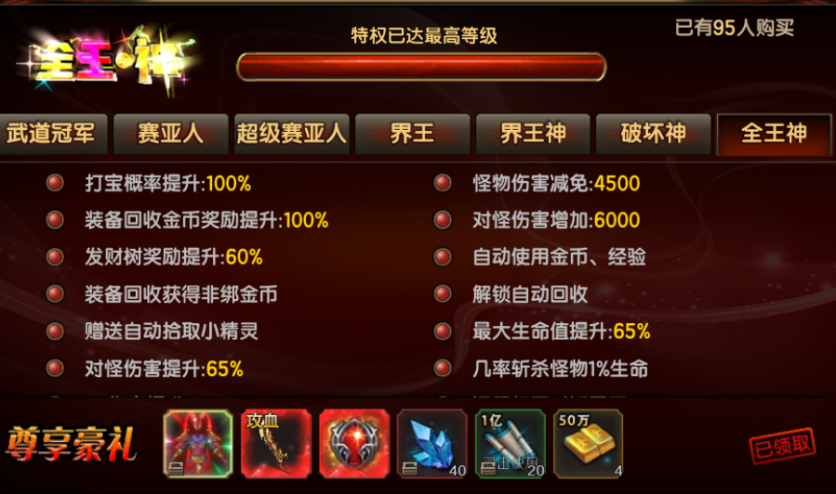 购买界王赞助特权后,回收比例和极品爆率大幅提升,重要的是解锁自动拾取,挂机效率瞬间提升,爽到爆!.
