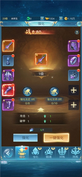 使用强化石,强化装备,提升装备属性。一键强化会将所有可强化的装备进行强化。一键强化优先强化等级低的装备部位。