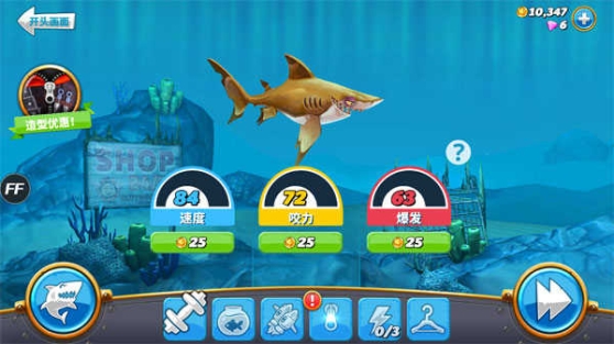 2、积分条满了(进行游戏就能获得积分)之后解锁该型号的鲨鱼,然后在使用金币购买。