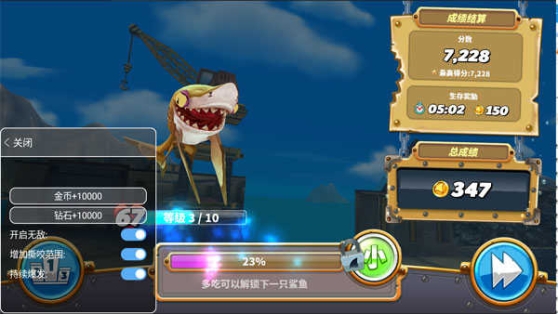字母:玩家在海中收集完HUNGRY全部字母后,鲨鱼就会巨大化,短时间进入无敌模式,什么都能吃。