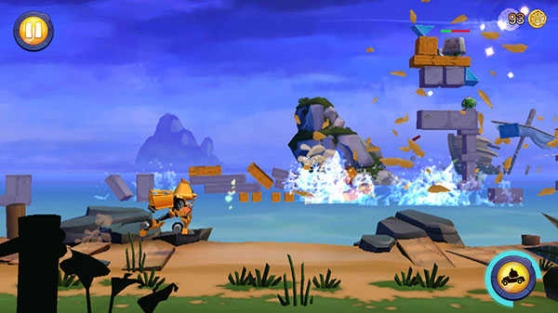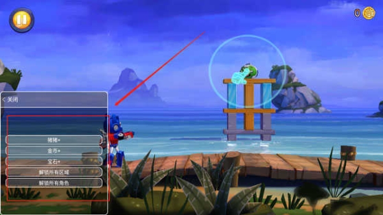 2、打掉底部冰块,消灭绿猪:一般情况下绿猪都是在建筑物上面的,前期玩家在没有升级变形金刚的时候,攻击力偏低。如果直接攻击绿猪的话,可能并不能在该屏幕跑酷过程中造成击杀。所以玩家只需要击碎屏幕红色方框"玻璃",建筑物会倒塌。绿猪都将会葬身大海,按照冰块>木块>石块的优先顺序进行射击。