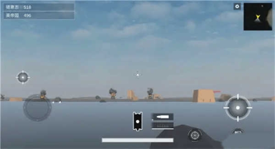 四、进入战场后,我们可以看到是坦克的第一人称视角,左边是摇杆操作移动,右边则是开火,在血条旁边的则是瞄准镜,非常有意思的是,当你击出一炮弹后,会有一个5秒的重新装弹时间,点击下方的小子弹则可以选择机枪模式,炮弹击出还可以看到真实的炮弹下落情况,不得不说,这物理引擎蛮有意思的。