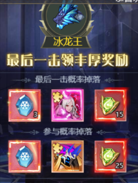 活动时间为12:10-12:40,21:10-21:40,奖励分为最后一击概率掉落奖励和参与概率掉落奖励,奖励如图下
