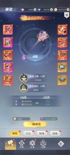 直接强化:进入各装备的页面均有一键提升功能自动消耗所需耗材强化装备