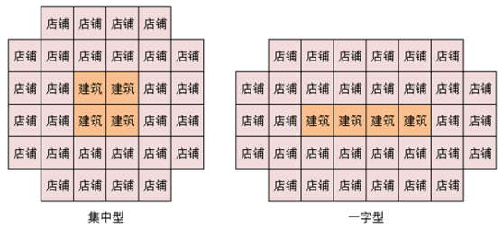 公益建筑:公益建筑能增加非常多的客流,从中心往四周递减,所以公益建筑尽量放在店铺中间,能发挥最大的效果。公益建筑的摆放方法多种多样,最简单的就是集中型和一字型: