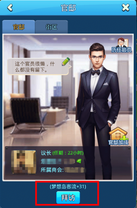 互访可以增加梦想岛的客流,所以每天的互访也必不可少。官员的官邸和公益建筑一样,能增加大量的客流,拜访议长的官邸也能增加客流。