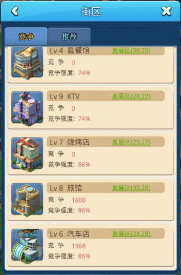 调查街区,尽量避开竞争强度高的店铺,同时提升店铺等级,培养店长,减小竞争带来的负面效果。