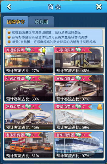 抢到了客流大家都有,合理分配实力,不同人抢不同档次的消费团,最后大家一起受益。这个活动拼的是谈判团实力,所以提升谈判团实力非常重要。
