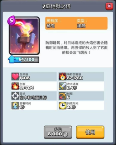 搭配技巧:这个卡牌一般是对抗敌方的血量较高的卡,所以一些较为低费的卡组可以搭配这张卡牌,因为低费卡的话,打法比较灵活,所以在搭配上很难有较好的高输出卡,那么在对抗一些高血量单位是比较难的,当敌方使用了高血量卡牌时,我们就可以用地狱塔对抗。
