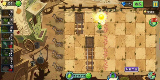 该关的向日葵一般种在屏幕中央的位置,目的就是为了防止鞭炮僵尸的侵袭,因为有矿车的阻挡,不能按顺序种植潜伏芹菜,我们可以在开头留两格。在第三个塔防格种植潜伏芹菜。