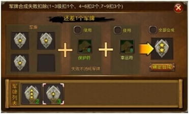 6)血战群雄:每一关获得五星之后,次日每天都能获得大量的军牌。军牌在背包-军牌-合成军牌这里合成,军牌合成过程中消耗的军牌是很多的,所以军牌嘛,多多益善。太多军牌合成可以勾全部合成,这样可以简掉过程。