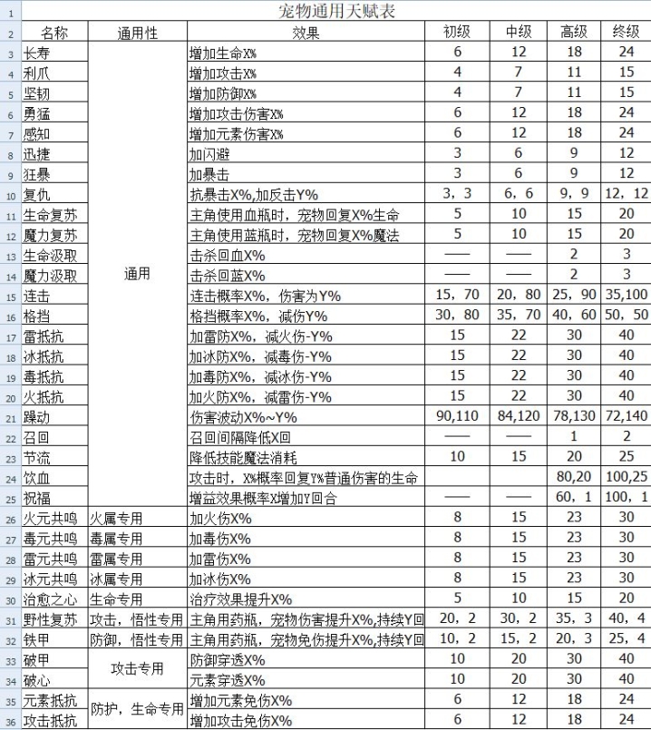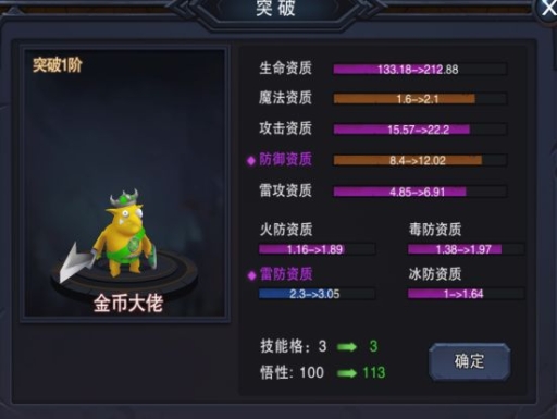 宠物的资质与成长,宠物开出的成长与技能个数都为随机,成长系数可按蓝,紫,金,红判断高低,技能个数范围是主技(主技能出生就固定了,后期无法升级)加1~3个被动。宠物在30级,50级,70级,90级,都有一次用相应突破石突破的机会!每次突破,成长系数都会变高,但在每一阶的成长系数比例会改变,有可能会变高,也可能会变低(多次突破后红可能会降到紫,蓝也可能升到金)!悟性也会有10~25的成长,技能格会有小概率加一个!