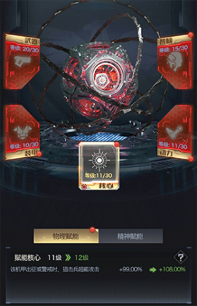 2、当以上四个模块赋能总等级达到20级时,可解锁核心的赋能。在极寒毁灭机甲出征或警戒时,增加狙击兵超能攻击,获得稀有的超能攻击属性。该攻击属性可以无视兵种防御直接造成伤害,同时享受兵种攻击同等的暴击等属性及各兵种伤害加成,非常强力。