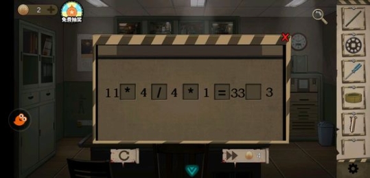 点击右边墙角钟下面的柜子,出现一道算式。从左面方框开始,在五个方框里依次输入运算符“*、/、*、=、/”,使等号两边的数字相等