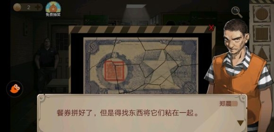 早上到餐厅吃早餐,先拼好狱警给的被撕碎的餐券,然后餐桌上拿胶水粘好