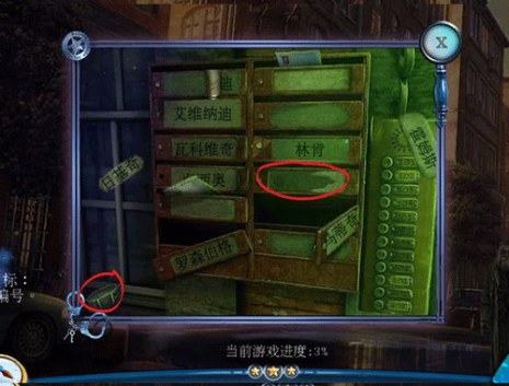 5、公寓大门,找到奇怪的锁部件2;一个个查看邮件箱,把门牌纸归们,直到找到斯夫人的邮件箱,使用紫光灯、指纹刷、指纹拓印得到指纹1。