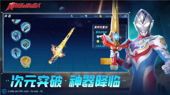 奥特双重剑,特利迦奥特曼&德凯奥特曼的武器。由特利迦奥特曼交给德凯奥特曼的武器,金色的剑刃和红色的握柄构成的剑型武器,可分别切换成【德凯模式】和【特利迦模式】,支持奥特次元卡牌和胜利超越之钥两种道具的联动。