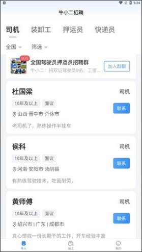 5、若为招聘者,可以选择司机的类型,亦可通过城市进行区域选择,选择完成后可以“联系”司机。
